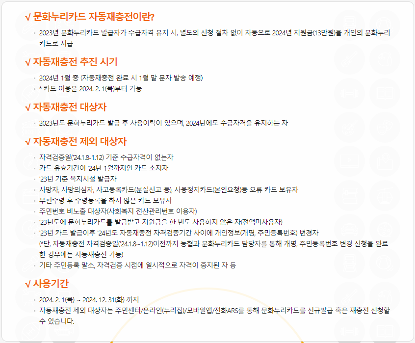 * 자동재충전이란? 2023년 문화누리카드 발급자가 수급자격 유지 시, 별도의 신청 절차 없이 자동으로 2024년 지원금(13만원)을 개인의 문화누리카드로 지급
